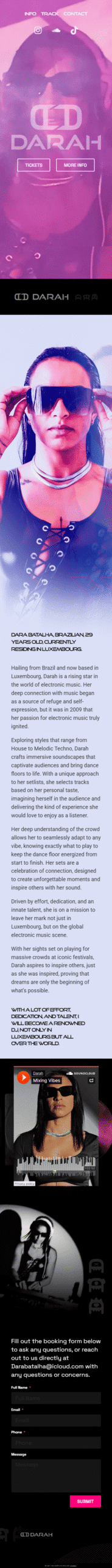 O site da Darah foi criado para ser simples, direto e funcional, no formato one page, facilitando a navegação do público. Nele, fãs e contratantes podem conhecê-la melhor, ouvir suas tracks autorais e, principalmente, ter acesso rápido e prático para entrar em contato e agendar shows. Um espaço digital pensado para transmitir sua identidade artística de forma clara e acessível.